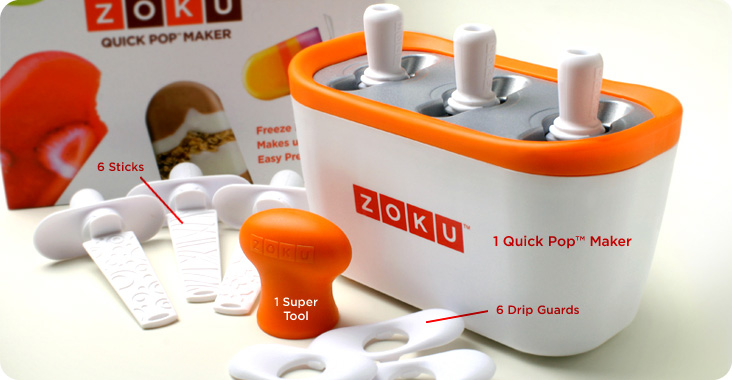 The Zoku Quick Pop™ Maker freezes ice pops in as little as seven minutes right on your countertop without electricity. Quickly make striped pops, yogurt pops or (for the first time ever at home) flavored core pops. To enjoy Quick Pops at a moment’s notice, simply store the compact base in your freezer. The kit includes six durable, reusable plastic pop sticks that have unique ridged designs that allow pops to adhere securely, with special drip guards for tidy eating. A specially designed Super Tool helps to quickly release the frozen treats from their molds. The unit can make up to 9 pops before refreezing the unit again. Includes 1 Quick Pop Maker, 6 sticks, 6 drip guards, and 1 Super Tool. Dimensions: 8" x 4.25" x 4.5" BPA and phthalate free. How It Works.The Quick Pop™ Maker freezes pops in as little as 7 minutes right on your countertop. Make striped pops, different flavored core pops, add your favorite fruit candy and nuts. The only limit is your imagination.